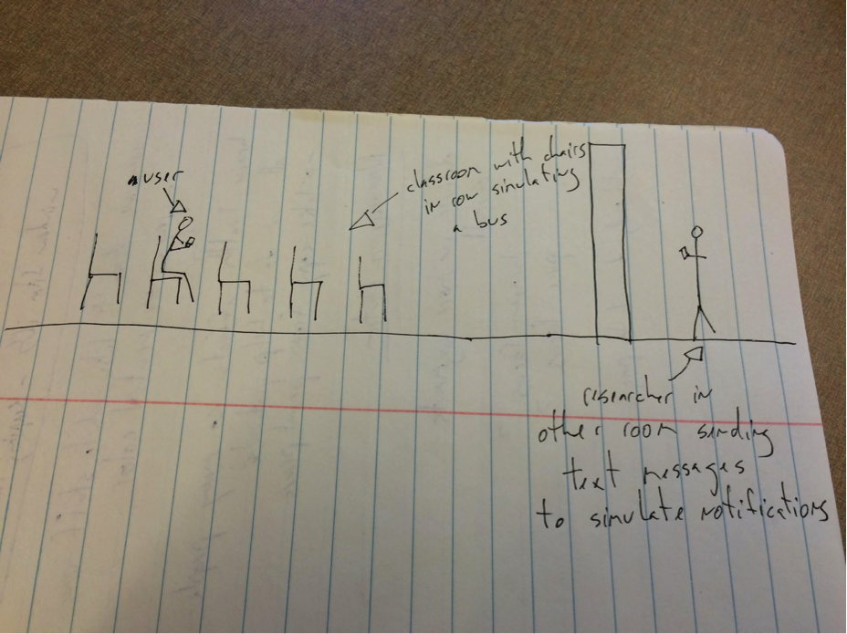 The user is at the bus stop, which is in a lab or classroom with a whiteboard. The whiteboard has a sign which indicates the location of a bus stop. Text messages are used to simulate notifications from the app. A recording is played to simulate street noise at a real bus stop.