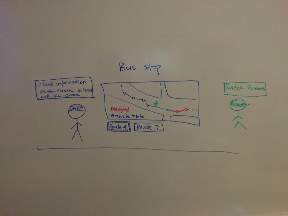 The bus stop is made up from foamcore. The interactive screen will be drawn on the board. A researcher will act as a wizard to react to the user’s operations.